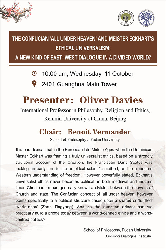 【学术讲座】THE CONFUCIAN ‘ALL UNDER HEAVEN’ AND MEISTER ECKHART’S ETHICAL UNIVERSALISM: A NEW KIND OF EAST-WEST DIALOGUE IN A DIVIDED WORLD?